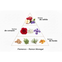 Flamenco no es solo un perfume, es una coreografía aromática. Su apertura, dulce y vibrante, mezcla el jugo afrutado de la frambuesa y la manzana con la delicadeza aterciopelada de la violeta y la luminosidad de la flor de azahar. Conforme avanza, el corazón floral se despliega como un baile elegante y sensual, en el que la rosa despliega su majestuosidad, el jazmín aporta su sensualidad luminosa y el iris deja una huella polvorosa y sofisticada. Finalmente, la fragancia se asienta sobre una base cálida y amaderada, donde el cedro y el ciprés se entrelazan con la frescura resinosa del pino y el ámbar profundo, creando una estela intensa y envolvente.